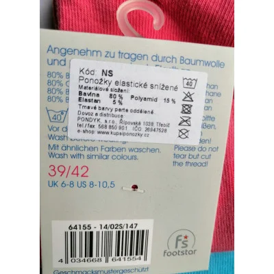 Elastické ponožky se sníženou - kotníkovou výškou lemu a hitem letošního jara - léta - proužky v neonových barvách. Jemný, příjemný úplet. Materiálové složení : 80% bavlna, 5% elastan.poliamid 15%.
