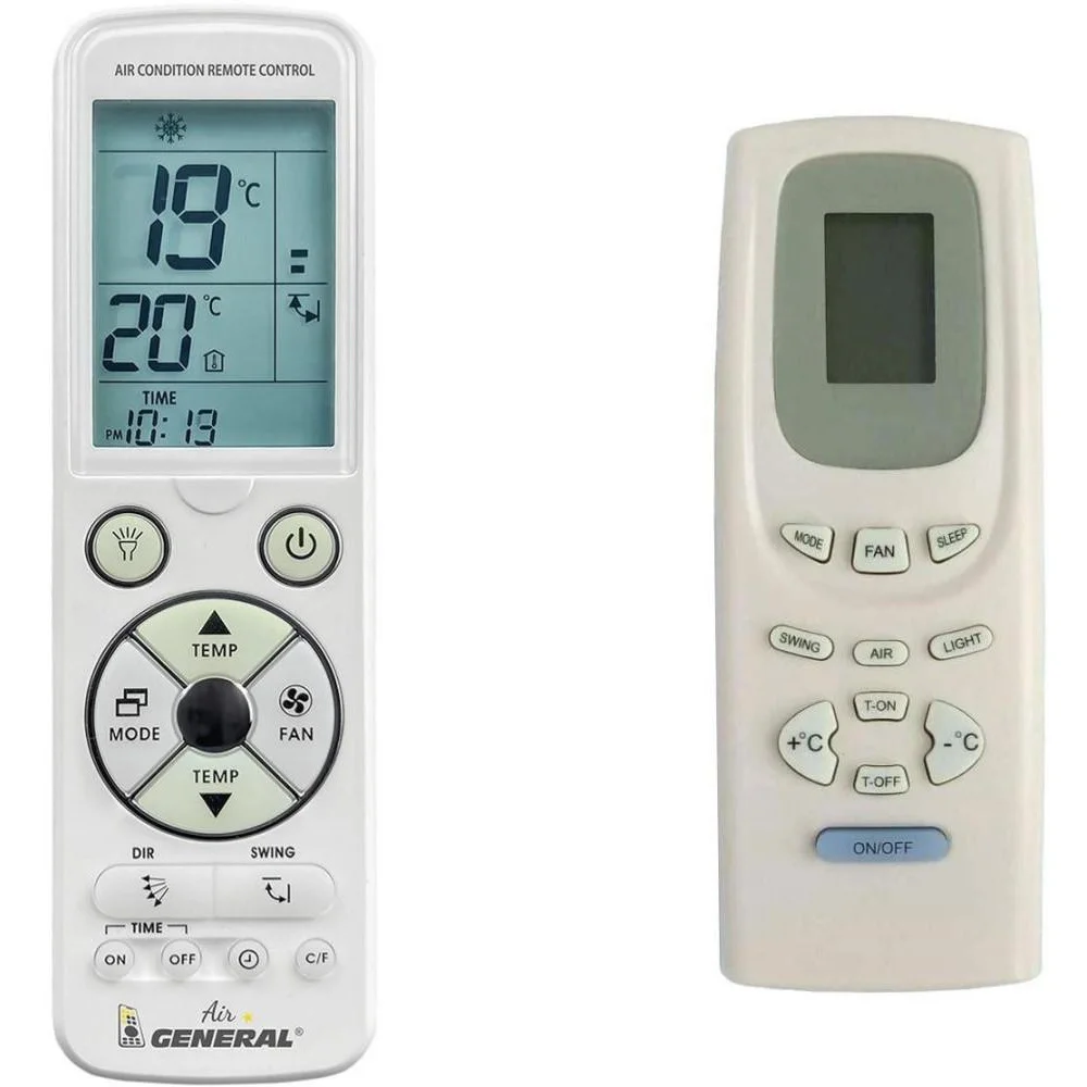 Ovladač je dodáván ve verzi dálkového ovladače General AIR (**zobrazen vlevo**), který byl vyroben speciálně pro klimatizace **COOLEXPERT**. Garantujeme vám, že obdržíte ovladač se všemi důležitými funkcemi vašeho původního originálního ovladače. Není třeba žádné párování, žádné kódy - stačí vložit baterie a ovladač je hned připraven k použití.