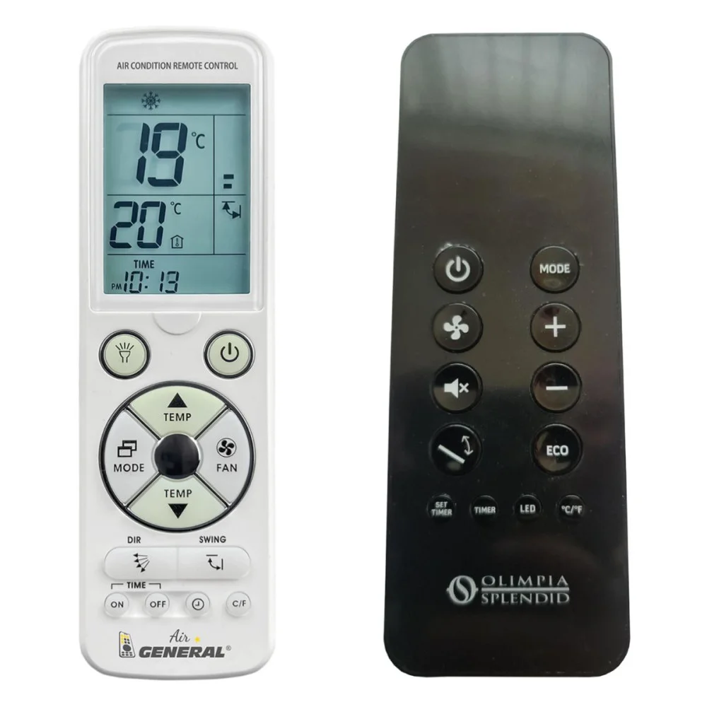 OLIMPIA SPLENDID Unico Pro Inverter 14 HP, 30 HP, Unico Tower 25 HP RVA, Unico Edge je 100% náhradou za originální dálkový ovladač. Tento ovladač je dodáván ve verzi dálkového ovladače General AIR (zobrazen vlevo), který byl vyroben speciálně pro klimatizace OLIMPIA SPLENDID. Garantujeme Vám, že obdržíte ovladač, který bude mít všechny důležité funkce Vašeho původního originálního ovladače.