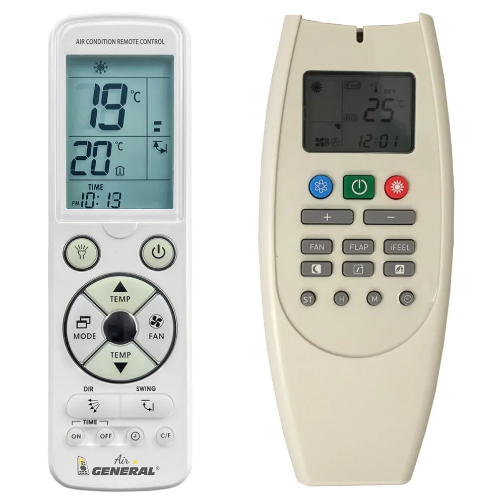 Ovladač je dodáván ve verzi dálkového ovladače General AIR (zobrazen vlevo), vyrobený speciálně pro klimatizace TECHNIBEL. Garantujeme, že obdržíte ovladač, který má všechny důležité funkce vašeho původního originálního ovladače. Není třeba žádné párování ani kódy. Ovladač je připraven k použití - stačí vložit baterie a hned funguje.