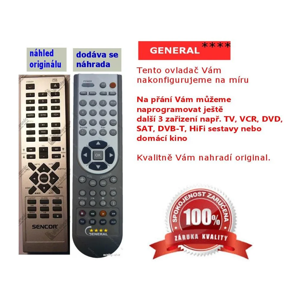 Dodává se ovladač s odlišným vzhledem, avšak s identickými funkcemi jako má původní originál. Tento náhradní ovladač nevyžaduje žádné složité nastavování ani zadávání kódů. Stačí vložit baterie a ovladač okamžitě funguje stejně jako originální verze.
