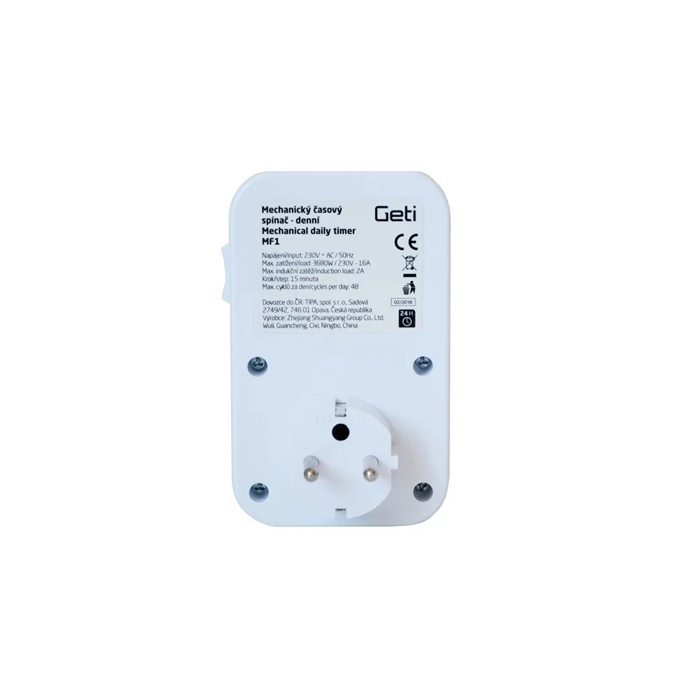 Pomocí **spínací programovatelné zásuvky Geti MF1** můžete snadno nastavit časy, kdy se vaše síťové spotřebiče zapnou a vypnou. Tato mechanická denní zásuvka je ideální pro ovládání spotřebičů ve vnitřním prostředí a nabízí denní spínací cyklus, což z ní činí efektivní řešení pro automatizaci vaší domácnosti nebo kanceláře.