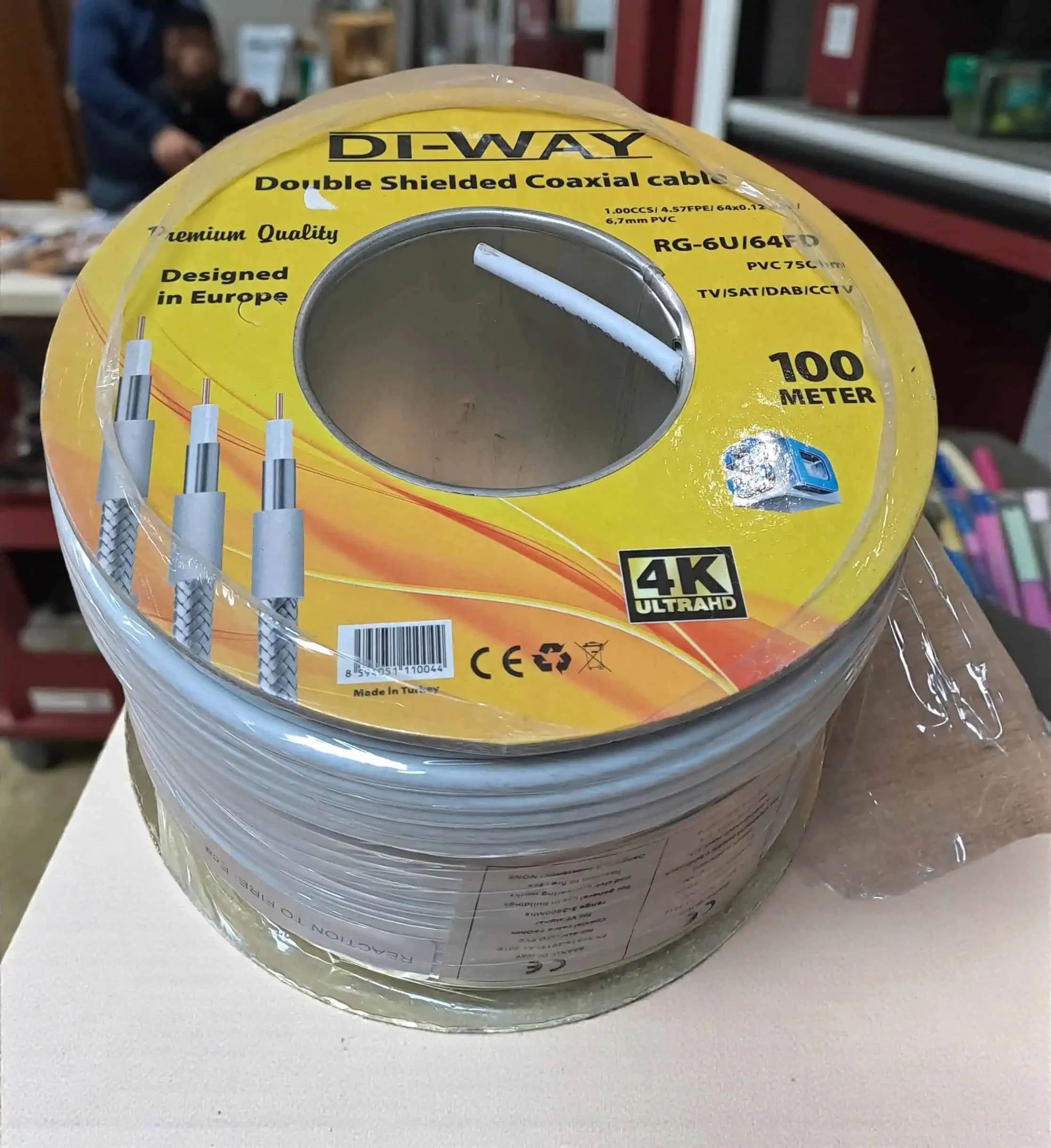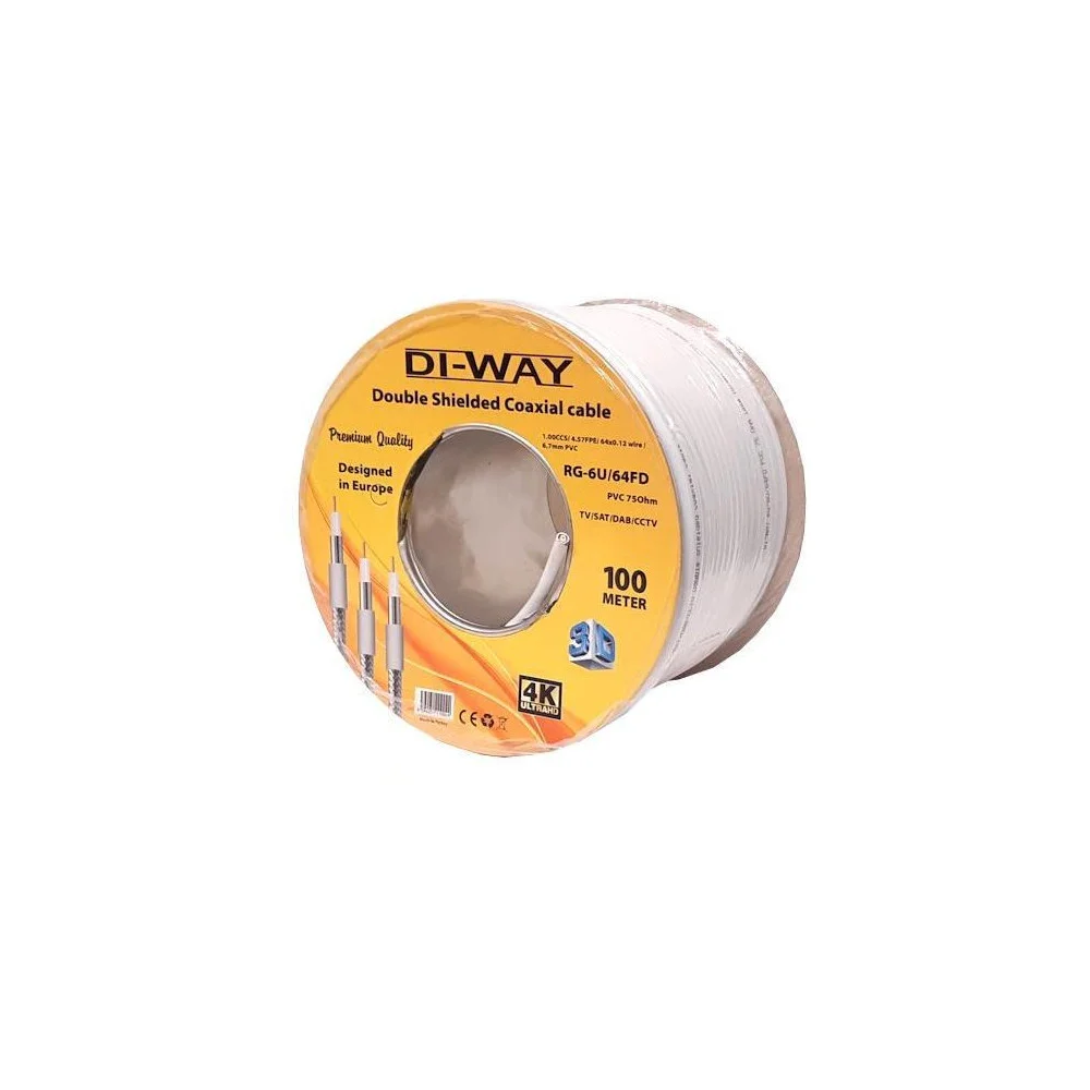 Koaxiální kabel DI-WAY RG-6U/64FD o délce 100 m s průměrem 6,7 mm je ideální volbou pro různé aplikace přenosu TV a SAT signálů. Tento univerzální koaxiální kabel je vyroben se středovým vodičem z CCS a dvojnásobným stíněním z hliníkového drátu, což zajišťuje výborné technické vlastnosti.